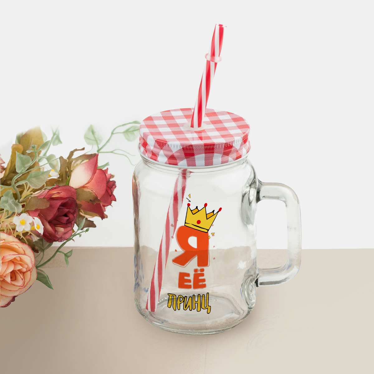 Банка с ручкой, трубочкой и крышкой, стекляная прозрачная (350 мл) Я её принц